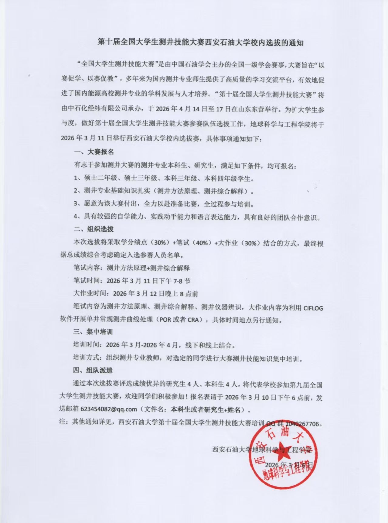 第十届全国大学生测井技能大赛西安石油大学校内选拔通知