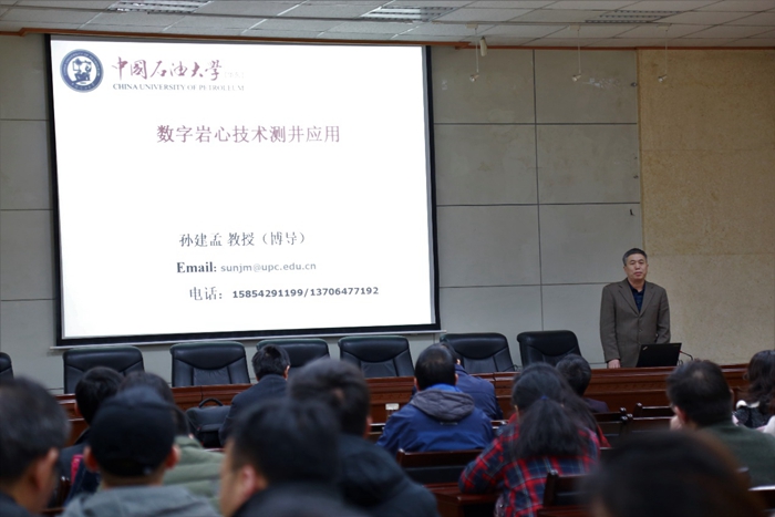 聘任仪式结束后,中国石油大学(华东)孙建孟教授以“数字岩心技术在测井中的应用”为题,在第三会议室为我校师生作了学术报告。孙建孟教授从数字岩心建模、岩石物理属性模拟等方面对数字岩心技术进行了介绍,指出数字岩心技术与常规岩石物理实验相比存在的优势,是研究微观因素对岩石物理属性影响的重要手段,同时展望了数字岩心技术在地质、地震、岩土工程等学科中的应用前景。