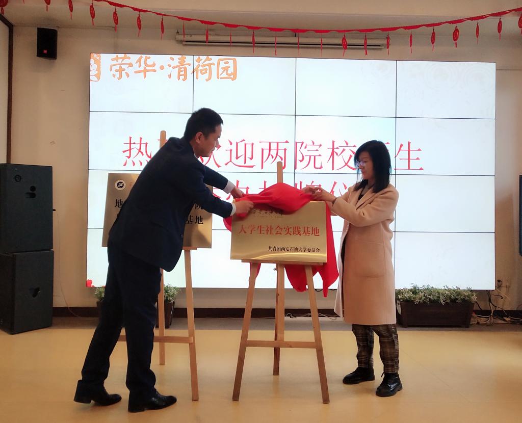 在荣华清荷园养老社区举行大学生社会实践基地揭牌仪式。荣华清荷园养老社区园长罗良忠、角球之家