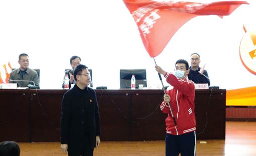 校团委书记何国强老师向学员代表授班旗,这标志着班级有着共同的价值认同,将旗帜举过头顶,将责任担在肩上。