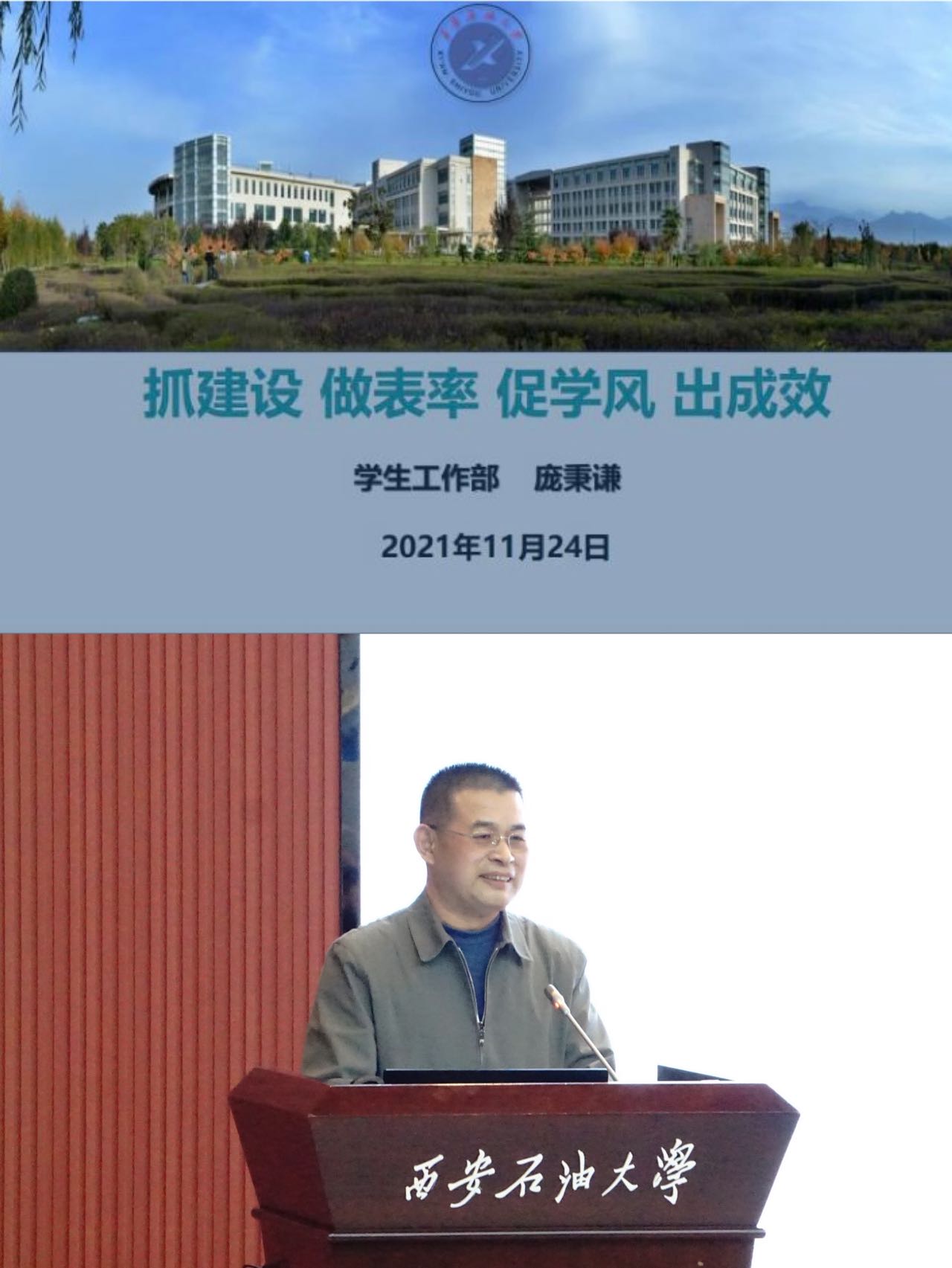 随后,校学工部副部长庞秉谦老师为全体学员做了题为《抓建设 做表率 促学风 出成效》的开班第一讲。庞部长分别从加强班级建设的重要性和必要性;如何做好班级建设工作;如何做一名优秀的班级学生干部三个方面向全体学员做了高站位、高质量的专题理论教学。尤其是在如何做一名优秀的班级学生干部方面,庞部长更是结合自己的学生工作经验和学生干部经历,深入浅出的引导学员们要把准学生干部的身份定位、正确处理学生干部的五个关系等方面做好具体工作,促进班级建设。最后他说道:“大家一定要传承地科院的优良学风,认真学习,不断完善自己,争做一名优秀的学生、一名优秀的学生干部,做好班级建设相关工作。”