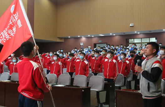 学生会主席靳兴同学带领全体学员面向班旗郑重宣誓,要坚定正确的政治方向,全心全意为同学服务。