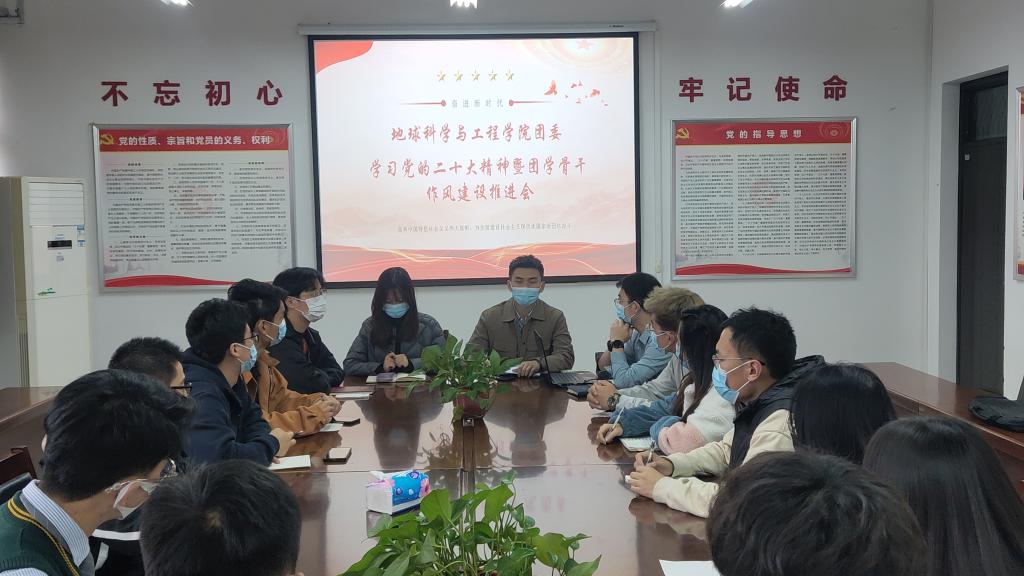 团委在开物楼507会议室召开学习党的二十大精神暨团学骨干作风建设推进会。学生会指导老师李佩琦、2019级团总支书记刘学斌、2022级团总支书记姜英哲、全体团学骨干、各班团支部书记代表参加会议,会议由2021级团总支书记刘宇航主持。