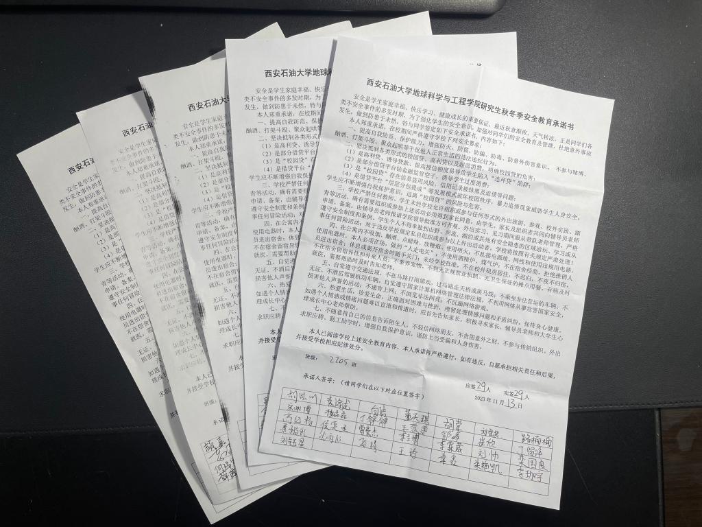 研究生辅导员姜英哲、陈斌围绕消防安全教育、心理健康教育、交通安全教育、网络安全教育、饮食卫生安全等方面内容,结合实际案例,针对秋冬季可能存在的各类安全问题,在全院分别召开了研究生年级大会、学生干部会议和主题班会,做到全覆盖、无遗漏。组织全体研究生学习了《研究生手册(2023年)》、《关于加强学生宿舍消防安全工作的通知》以及《西安石油大学校园文明骑行倡议书》相关内容,在校研究生签署了《角球之家官网