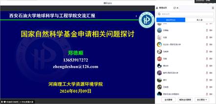 邀请河南理工大学郑德顺教授在腾讯会议作国家自然科学基金申请经验报告,刘之的副院长和60余名教师参会,系主任郭峰教授主持。