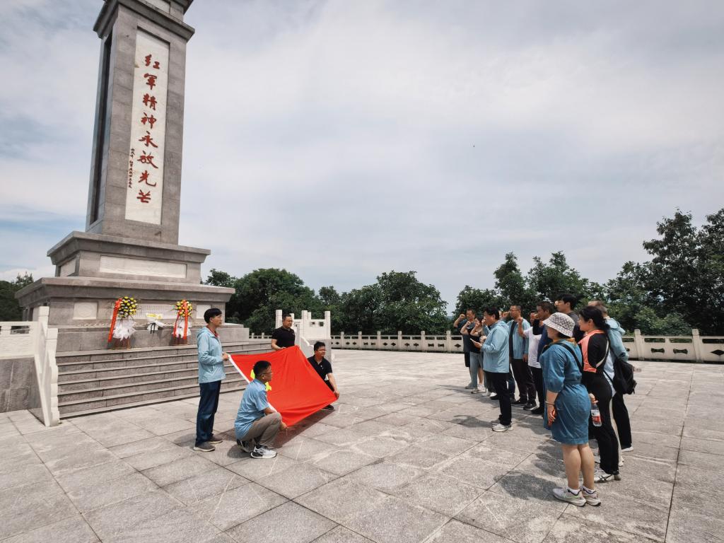 随后,全体党员一同前往红军纪念碑,向革命烈士肃立默哀,鞠躬致敬,在鲜红的党旗下,大家高举右拳庄严宣誓,重温党的铮铮誓言。