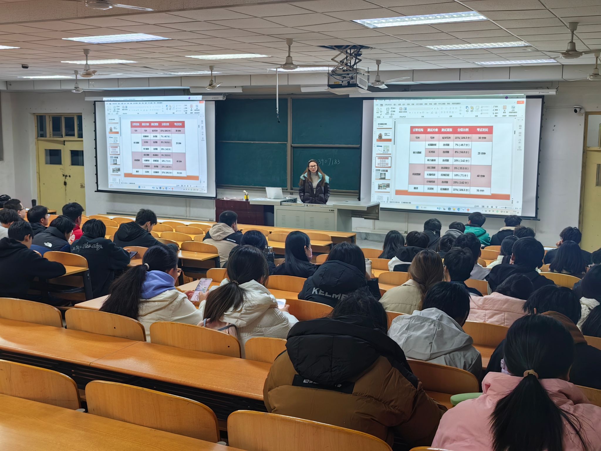 特邀英语四级考试指导老师周冰为同学们授课。讲座中,周老师结合上一场考试真题,分享了四级考试的解题技巧和策略,包括听力的抓取关键信息、阅读的快速定位、写作的结构等,为同学们指明了备考的重点和方向。