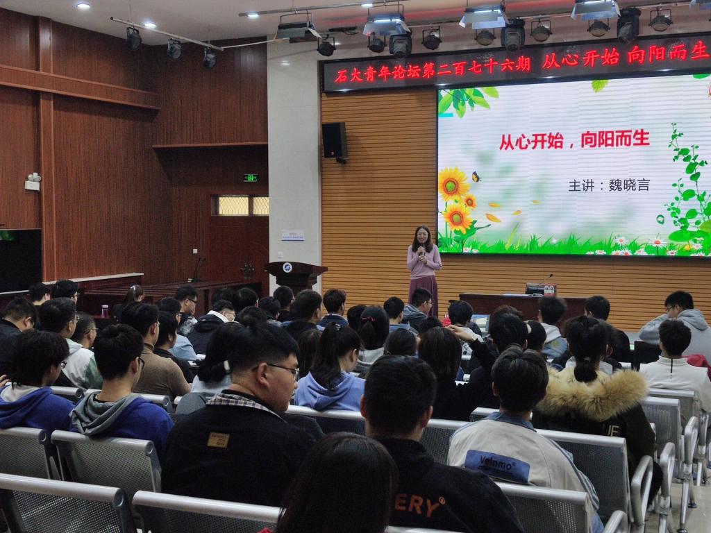 承办的第276期石大青年论坛:从心开始,向阳而生,在鄠邑校区就业多功能厅顺利举办。此次论坛主讲老师是学生心理成长指导中心魏晓言老师。